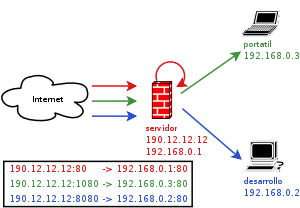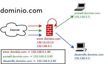 Definamos el entorno: 3 ordenadores con sistema operativo *nix, cada uno con su Apache, el principal es servidor haciendo a su vez funciones de firewall:- servidor: (190.12.12.12 - 192.168.0.1)